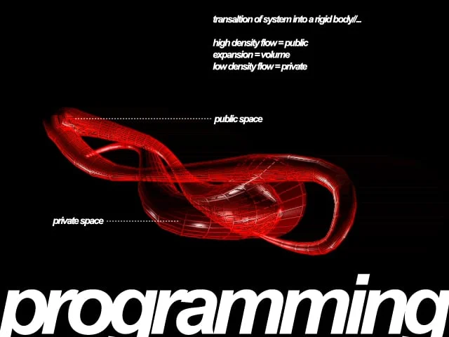 After many iterations, patterns of flow emerge in each instance of the experiment and these flow patterns are read as thediagram of the building. The larger and faster flow becomes the public area of the building and conversely, the lighter slower regions are read as private. The diagram is then programmed based on area requirements for each public and private component.